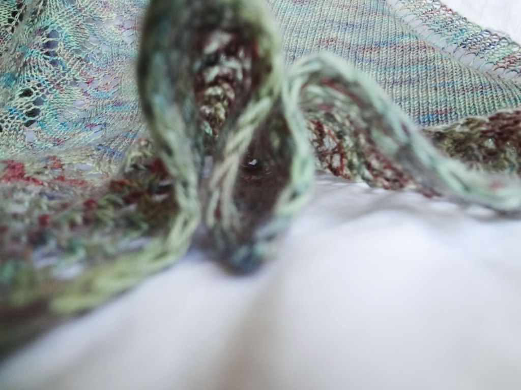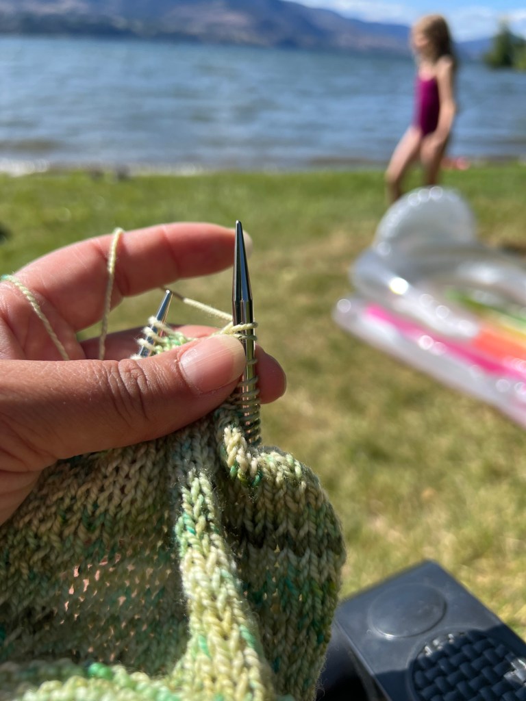 The pattern was Rosemarie’s Garden Shawl. A pattern written for a family friend who’d retired to Penticton when I was teen. Rosemarie taught me to knit. She passed with dementia a number of years ago. We were heading to Penticton. My daughter asked me to teach her to knit on that trip. I picked up needles and began to see those life patterns.